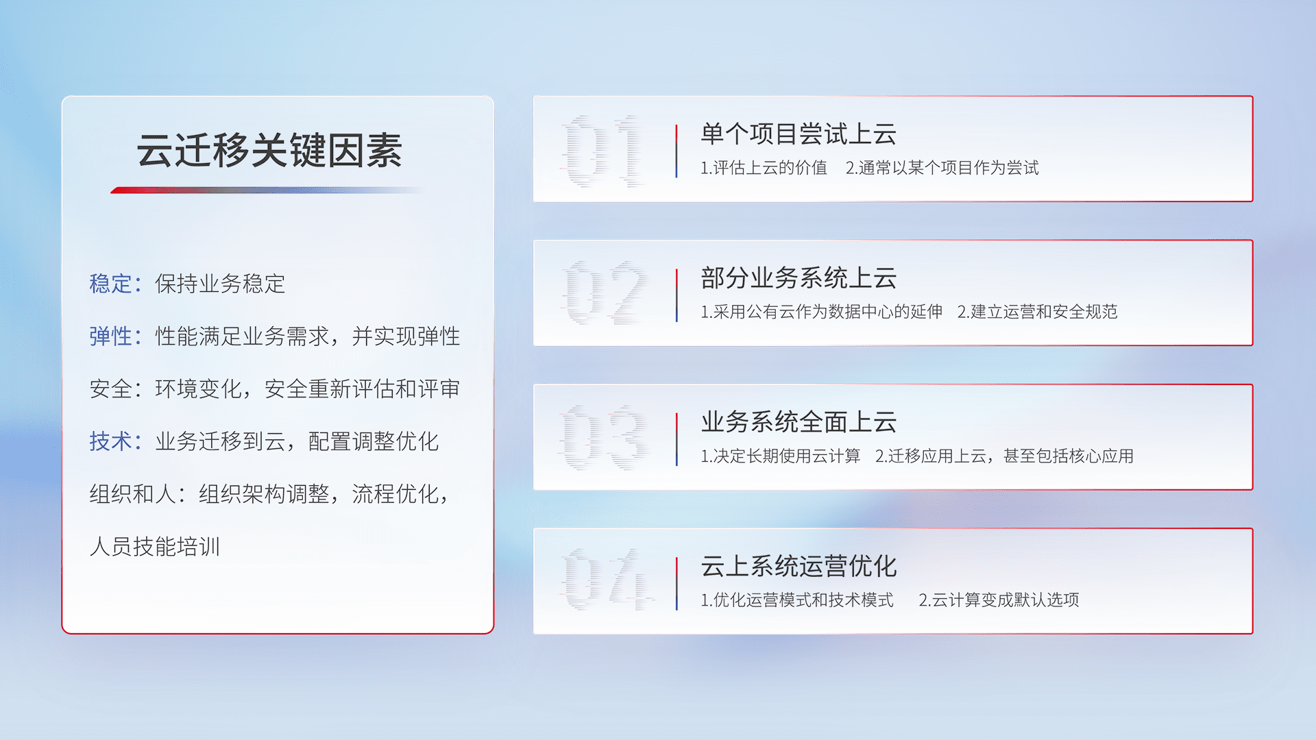 结合实际业务,,,从规划设计、、云平台选型、、、、云原生改造、、、、数据迁移、、集成交付,,,迁移全过程为客户识别最佳上云路径,,,做好风险识别管理,,设计网络架构、、身份权限、、、、安全审计合规、、、、操作审计、、、、日志审计、、、监控告警策略、、、、多站点容灾设计等,,对云上基础设施进行整体规划,,,,提升IT治理水平,,,,以满足弹性、、高可用、、高性能的需求。。