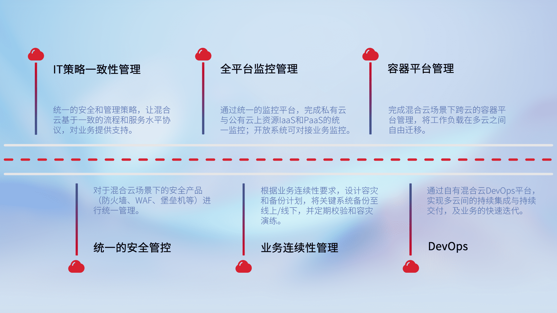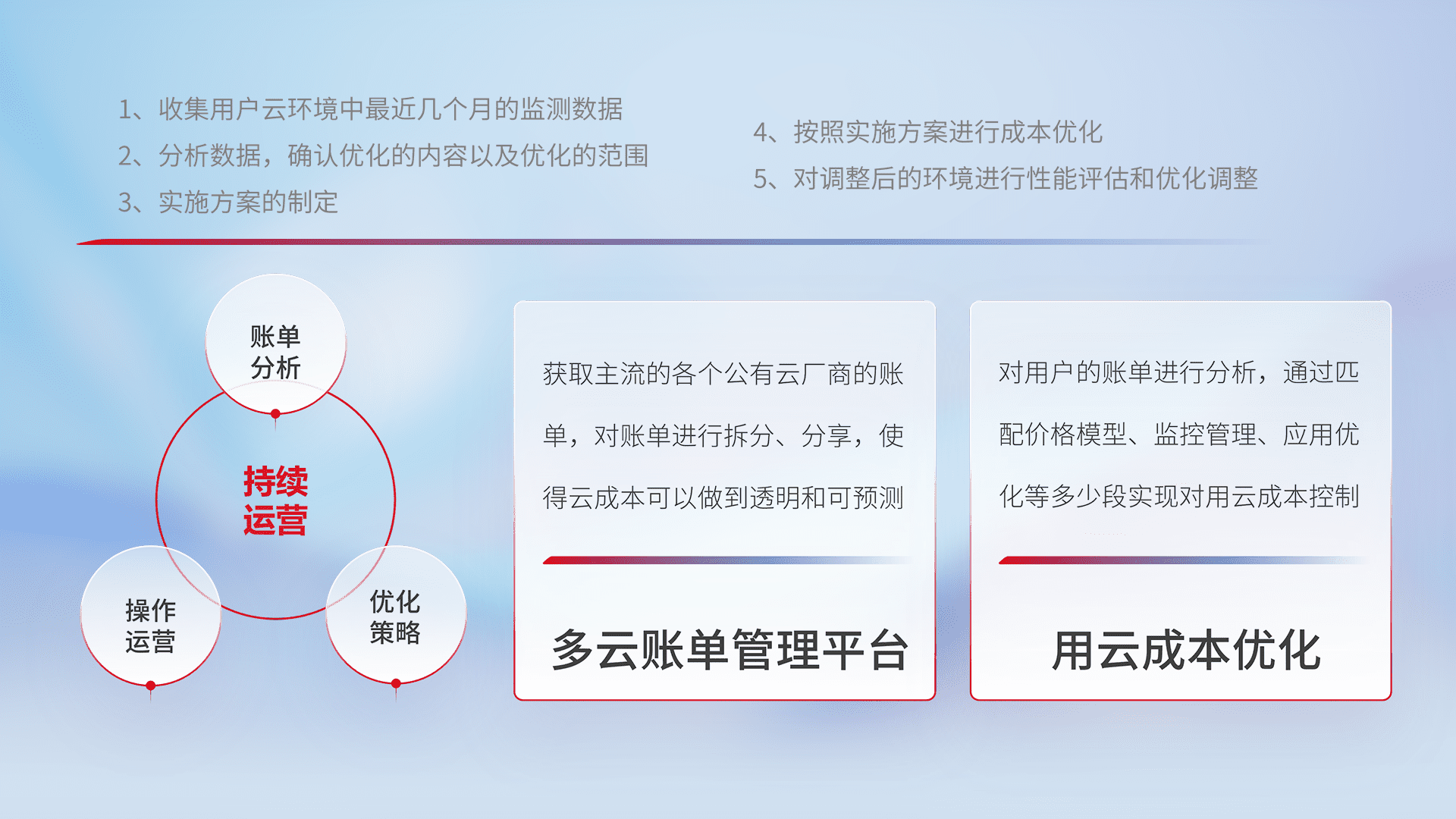 通过多云纳管,,,,以统一的资源数据模型把客户的云资源进行抽象和封装,,,,进而实现对多云资源的统一操作,,保障云资源管理的可靠性、、、稳定性与可用性。。。。量身定制化运维内容,,配置、、、开发运维、、、补丁管理、、备份、、监控、、认证和访问管理、、审计和日常巡检等,,,保障在用云过程中的可靠度,,,,稳定度以及高可用率。。。。