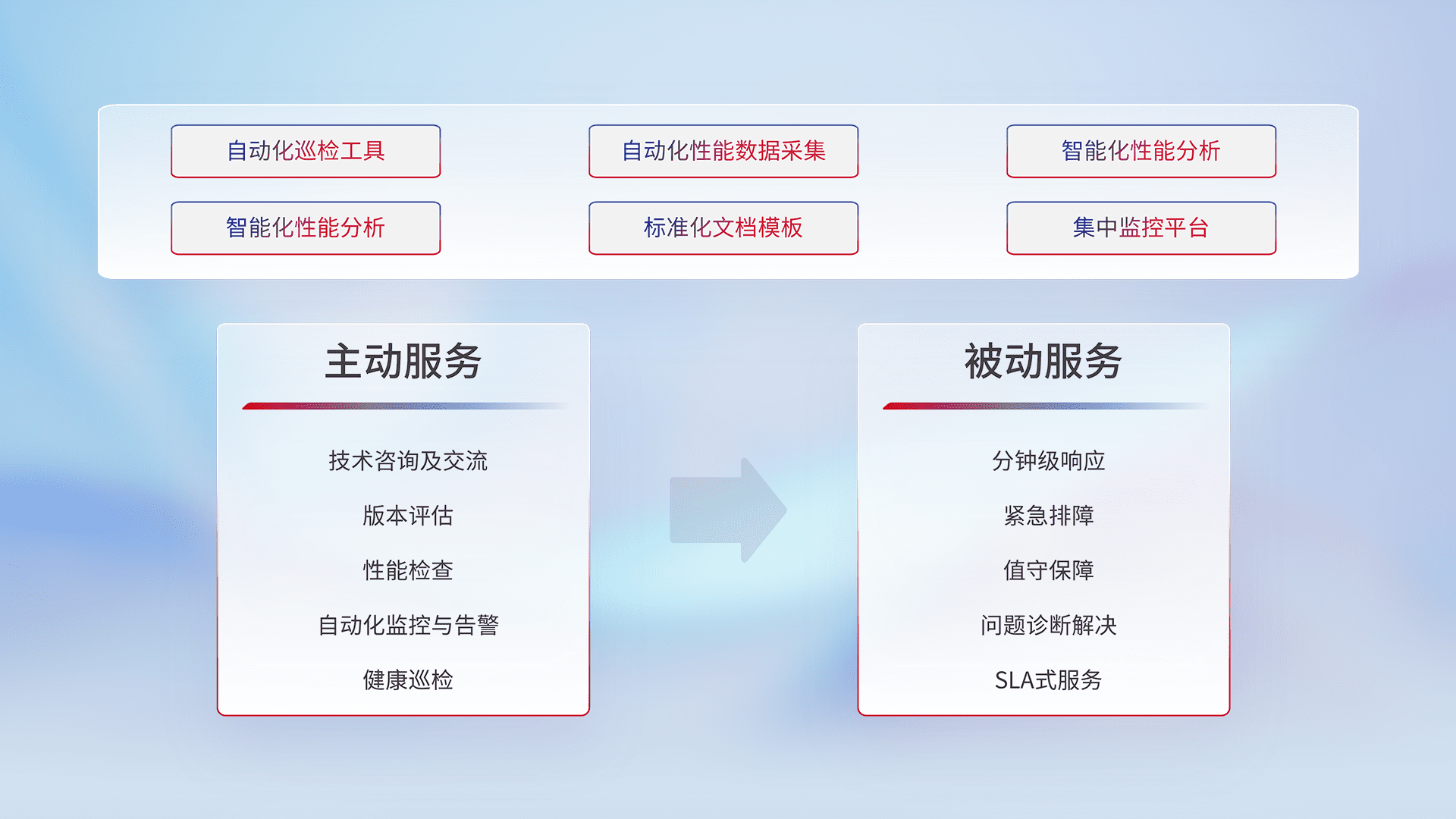 智能化工具和标准化文档,,,保障服务质量,,,,提供主动服务(包含技术咨询、、、版本评估、、性能检查、、、自动化监控与告警、、健康巡检)和被动服务包含(分钟级响应、、、紧急排障、、、、值守保障、、问题诊断解决、、、、SLA服务)。。
