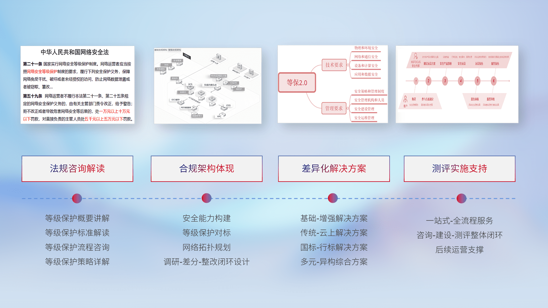 通过专业的法律咨询解读、、合规架构体现、、、、差异化解决方案、、、、测试实施支持等服务,,,,为客户量身打造等保合规体系。。。。